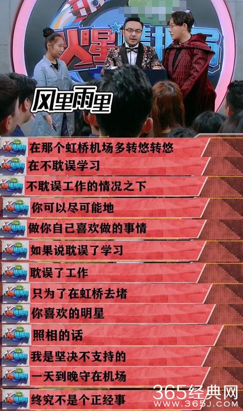 事情发展到今天的地步,你我都不能评论是对是错,就像汪涵说的:“在虹桥机场多转悠,在不耽误学习,不耽误工作的情况下,你可以尽可能的做你自己喜欢的事情,如果说耽误了学习,耽误了工作,只为在虹桥去堵喜欢的明星照相话,我是坚决不同意的,一天到晚守在机场,终究不是一个正经事”