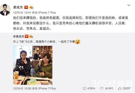 之后,“虹桥一姐”再次蹲点机场,买汉堡向袁成杰道歉,而袁成杰的暖心回复她:“我从来没生过你的气”,非常的温柔,还叮嘱“虹桥一姐”要好好学习。 2016年12月18日,“虹桥一姐”开通微博,并作出澄清,请大家不要上当。19日,她再次发表视频力证是本人,并感谢大家的支持。