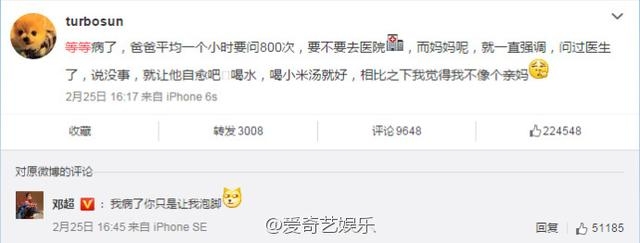 邓超回应道,自己生病了孙俪也只让自己泡脚,邓超应该觉得自己娶了个假老婆吧,别人家的老婆都是让喝热水,姜汤,要不就是去医院,只有孙俪一年24个节气每次都发微博说泡脚,对泡脚有一种迷之执着,不过娘娘的方法也可能有用,邓超不就好好的活到现在了吗?相比之下,正应了网友们的话,邓超在家简直没地位,任劳任怨,任打任骂,果然,娘娘的男人不好做!