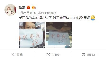 杨紫手拿一张“我要瘦”的减肥宣言,附文说:“反正我的态度是摆在这了,对于减肥这事,心诚则灵。”还画了一张励志的哭脸。