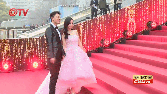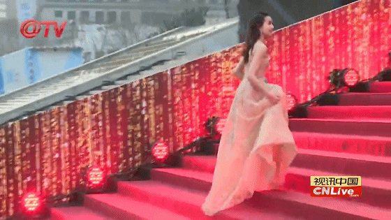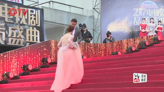 董洁跟杨紫穿得差不多,也是一袭大长裙,看到这道楼梯心里暗暗叫苦。