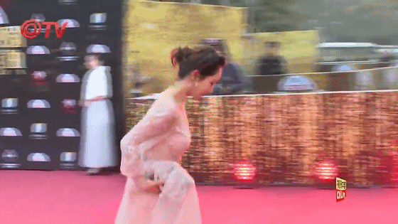 但是红毯上她一个人独来独往,她手里拎着拖拖拉拉的大裙子,一步一步小心翼翼,场面一度很尴尬。