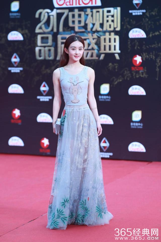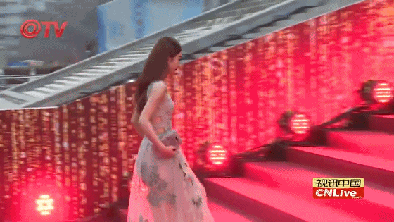 赵丽颖也是一袭透视长裙,上楼梯时深一脚浅一脚。