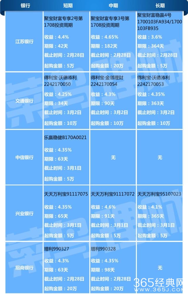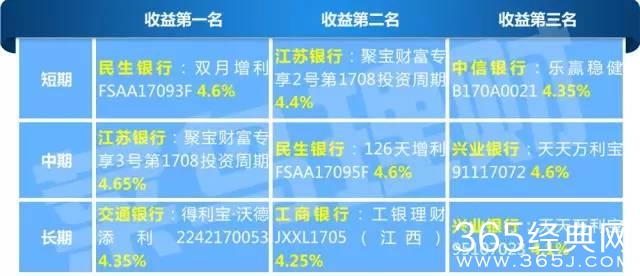 银行理财产品风险小,主要看收益。短期:3个月以内;中期:3个月—1年;长期:1年以上。