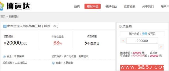 还有一个更震撼的5天预期年化收益率高达88%的“新西兰恒天然乳品第三期(限投一次)”项目,总融资额度2亿元,起投金额20万元。