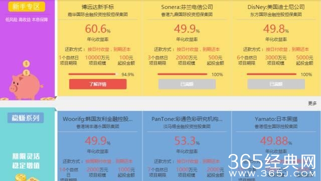 至于产品这一块,菜导在官网上看了一下,亮瞎眼了,预期年化收益率可达到49.8%、49.9%、53.3%、60.6%,产品期限则有1天、3天、6天、7天、14天、15天,还有包括迪斯尼的项目可以投资。