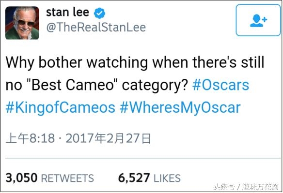 日前,斯坦·李发推特抱怨:奥斯卡有啥可看的,都没有最佳龙套奖
