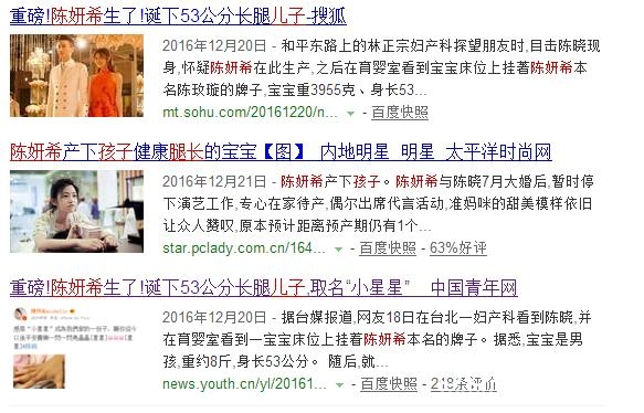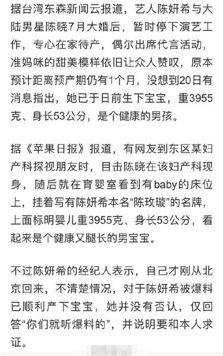 2016年12月,陈妍希与陈晓7月大婚后,暂时停下演艺工作,专心在家待产,偶尔出席代言活动,准妈咪的甜美模样依旧让众人赞叹,原本预计距离预产期仍有1个月,没想到12月20日有消息指出,她已于日前生下宝宝,重3955克、身长53公分,是个健康的男孩。