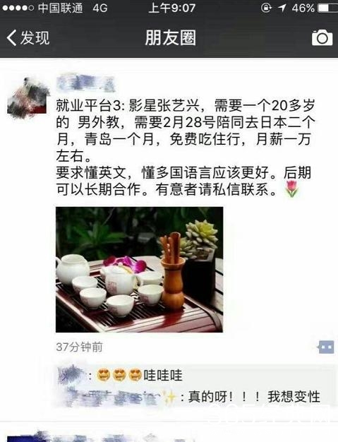 张艺兴这边需要一个20多岁的男外教,说是2月28号陪同去日本两个月,青岛一个月,免费吃住行,月薪一万左右