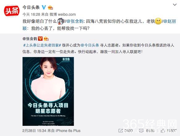 热心公益的张含韵是咱们今日头条寻人项目的明星志愿者,同样关注公益的好盆友赵丽颖说记几的心丢了,问小花能帮她找一下吗?互相斗嘴又恩爱的两只,娱乐圈有这样的友情真是难得。