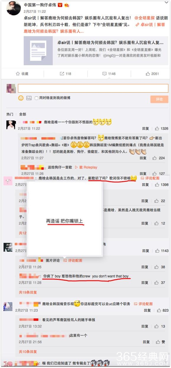 好巧不巧鹿晗刚发歌卓伟就发了以“鹿晗为何频去韩国”为题的八卦。粉丝直接甩《敢》歌词开启怼卓大大模式,场面甚是壮观。