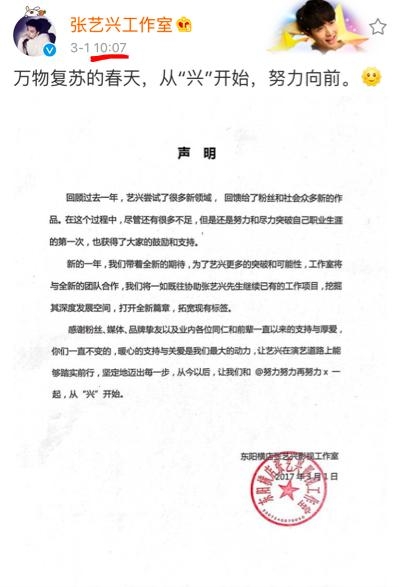 张艺兴换团队啦!今早10:07,张艺兴工作室发声明称“万物复苏的春天”“工作室将与全新的团队合作”。