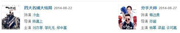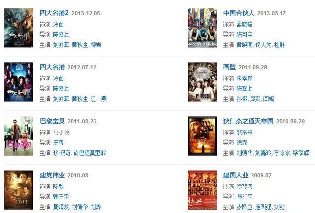 《四大名捕》《分手大师》《画壁》,还有口碑较好的《中国合伙人》《巴黎宝贝》,还参演了《建党伟业》《建国大业》。