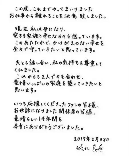 大意就是:在成为母亲后颇受触动,希望全力守护家庭幸福。自己已经与丈夫商量好退出一事,以后要回归家庭。