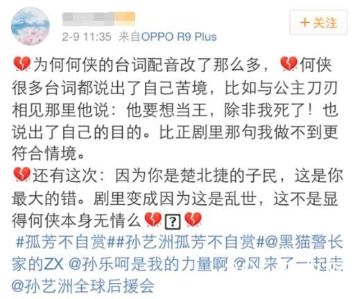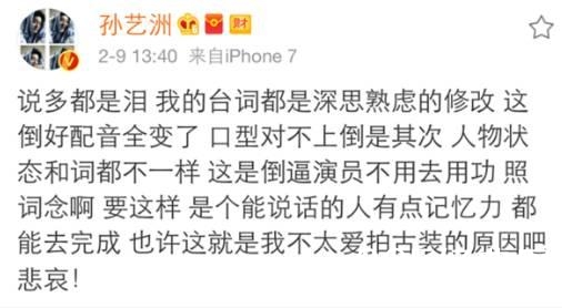 连孙艺洲本人都发博表示不满配音乱改台词,致使他的人设与演技遭到质疑。
