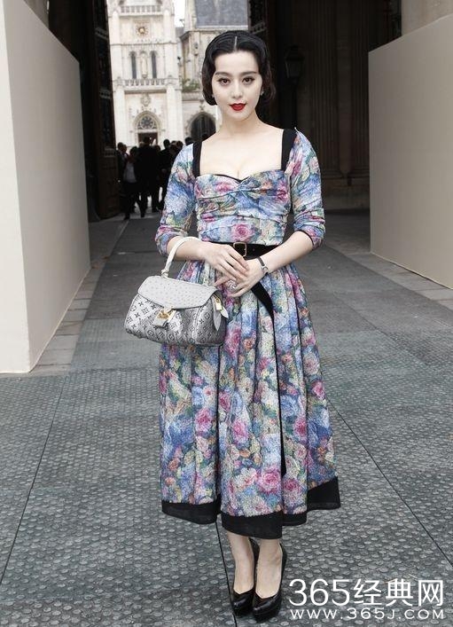 范冰冰身穿一袭碎花的连衣裙,抹胸的设计显得十分性感,增添了很多女人味,发型的设计十分巧妙,有一股贵妇风范。