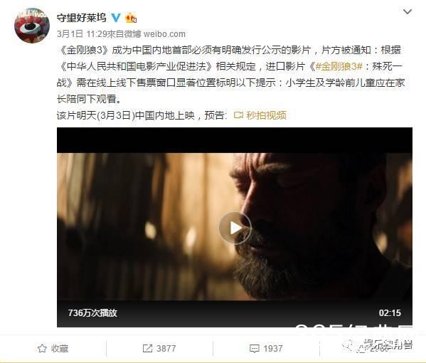 昨天中午,一则“《金刚狼3:殊死一战》成中国内地首部有明确发行公示影片”的微博引起了轰动,这个公示的出现也就意味着《金刚狼3》成为内地第一部得到“分级”的影片。