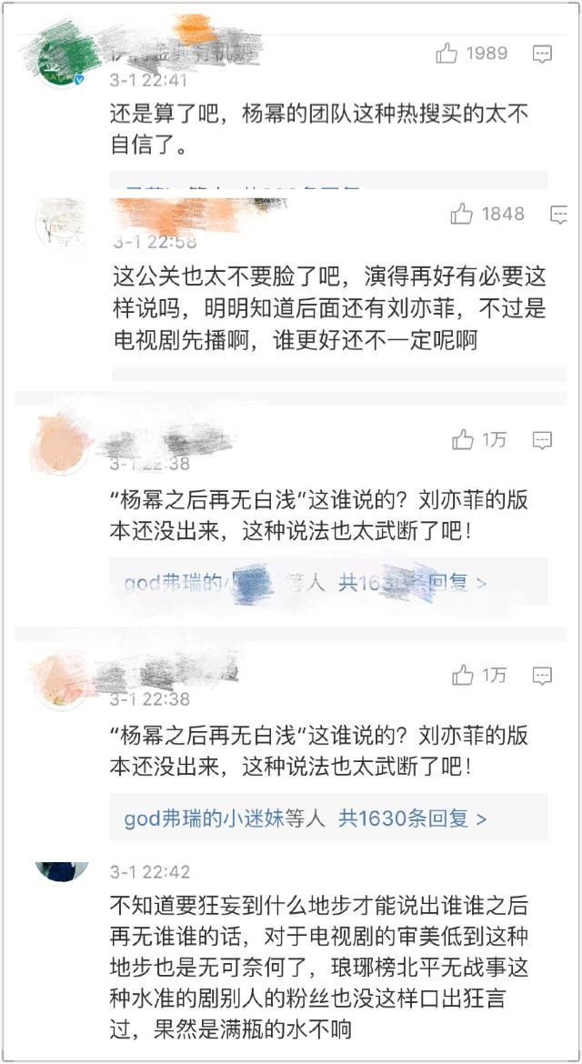 而随之而来的质疑,谩骂一堆,有人说杨幂公关买热搜,口出狂言。但是人家团队真的会蠢到电视剧已经播完了来买一个这种饱受争议的热搜吗,先不说杨幂在这部戏里已经赢得了演技的口碑,那为什么还要买这种摆明了被喷的热搜呢,况且刘亦菲版也还未出。这就要挑拨两人间的关系吗?现在倒是质疑新浪的用意了,昨天大结局几乎没有见到有话题在热搜上,今天突然就上了这样一个来意不善的话题,不会也被收买了吧