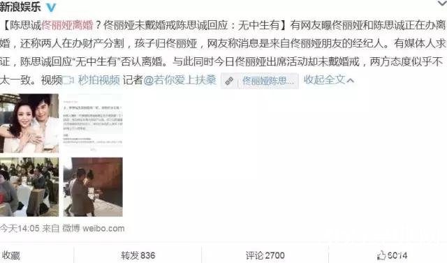 随后新浪娱乐便曝光了佟丽娅出席活动未带婚戒的消息。