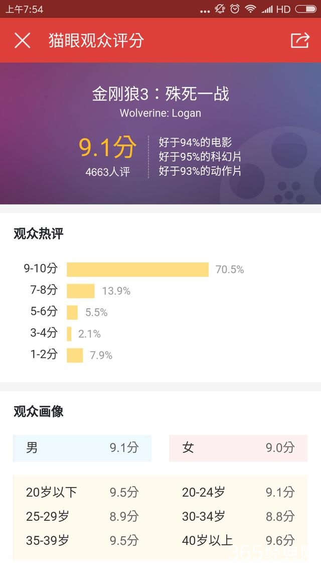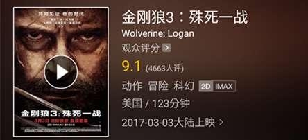 目前,猫眼观众评分9.1分,超过《X战警:逆转未来》9.0分创系列新高,共有4663个观众参评,70%的观众给出9-10分好评分,13%的观众给出7-8分,只有7.9%的观众给出1-2分的差评分。认为该片好评的观众集中评价英雄迟暮这一悲伤的主题,看完电影感觉像失去一位挚友,感谢休杰克曼,演绎的金刚狼如此传神,绝对够戳泪点,结局看哭了,非常感人。