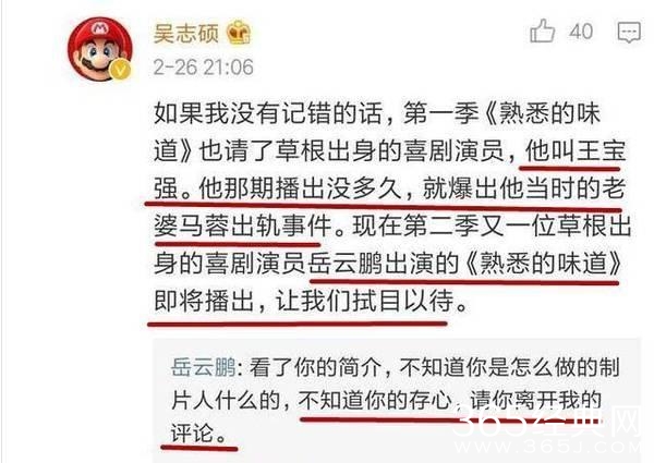 作为这期节目的嘉宾,小岳岳是相当卖力,开播前一个小时还专门发了一条微博宣传。但让他自己都没想到的是,微博一曝光却引来了众多的高仿号,其中一位真制片人的评论格外亮眼。对方竟然在留言中称:“如果我没有记错的话,第一季《熟悉的味道》也请了草根出身的喜剧演员,他叫王宝强。他那期播出没多久,就曝出他当时的老婆马蓉出轨事件。出现第二季又一位草根出身的喜剧演员岳云鹏出演的《熟悉的味道》即将播出,让我们拭目以待。”