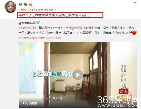虽然郑敏并没有在这件事之后回应,但在她节目播出前两天转发的一条微博也能看出她的态度。2月24日的时候,郑敏转发了《熟悉的味道》节目预告,对于岳云鹏小时候的艰苦条件连连感慨:“年岁长了,我竟然笑点越来越高,泪点越来越低了……”简简单单的一句话就能感受到她是真的很爱小岳岳。