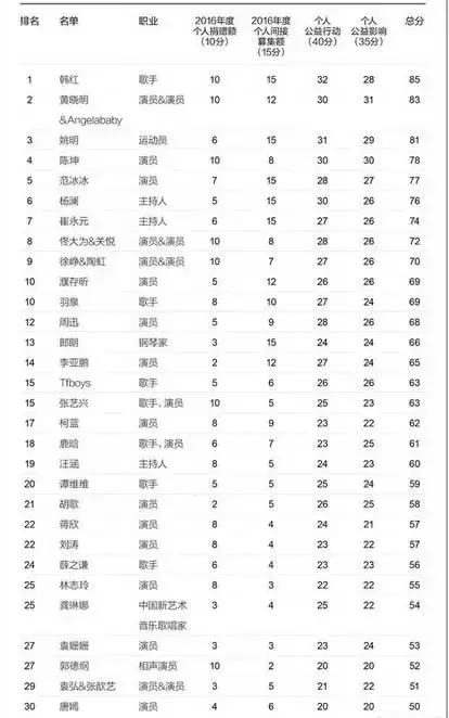 2016中国慈善名人榜是结合明星在2016年里在慈善、公益领域的整体表现做出的排行。