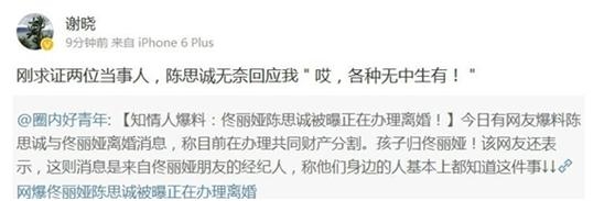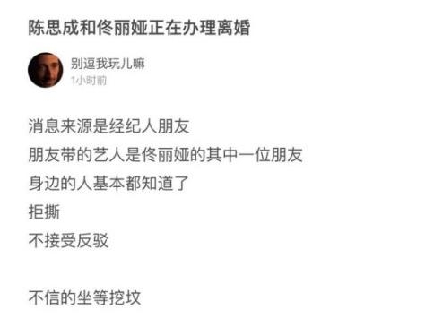 佟丽娅和陈思成已经办理离婚的消息刚爆出没有多久,网络上就有一个微博号发出这样一句话,刚求证两位当事人,陈思诚表示自己和佟丽娅一切都好,没有离婚,当然这也是只是一个网友给出的一些信息,真假无法辩驳。