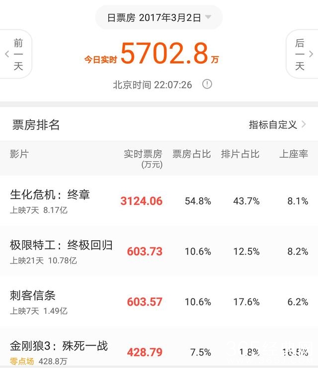 3月2日,截至22:07,中国内地电影市场票房报收5702万。《生化危机:终章》上映7天票房破8亿,达8.17亿元。《刺客信条》1.49亿,《极限特工:终极回归》10.78亿,本周末有望过11亿。《金刚狼3:殊死一战》零点场票房428万,远远不如《生化危机:终章》零点场1577万元的成绩。
