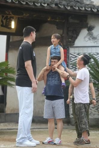 这是姚明参加爸爸去哪儿时的照片,当时多多坐在爸爸黄磊的头上依然需要仰视姚明,多多的表情更是惊讶,似乎再说:他怎么可以这么高!
