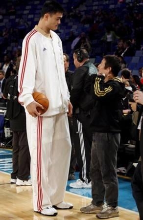 面对像姚明这样的超级大个子,你可能觉得,他蹲着你站着;他坐着你站着;或者你站在桌子上。但是我想说最好的方法就是:不要和姚明合影!