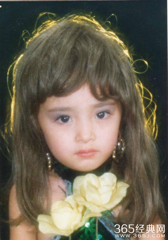 头戴假发,耳戴大耳圈,手上拿着假花,杨幂童年拍摄写真颜值极高,可以说是最美洋妞。