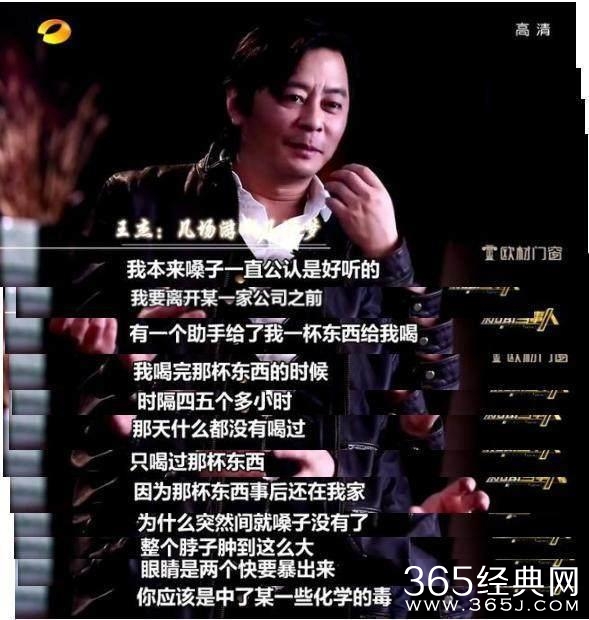 成龙大哥还爆料出他知当年王杰是被谁下的毒,但是现在他不能说。当年王杰在要离开某个唱片公司时,被助理在饮料中下毒,险些要了王杰的命,虽然后来生命没事,但是一副好嗓子就这么被毁了。