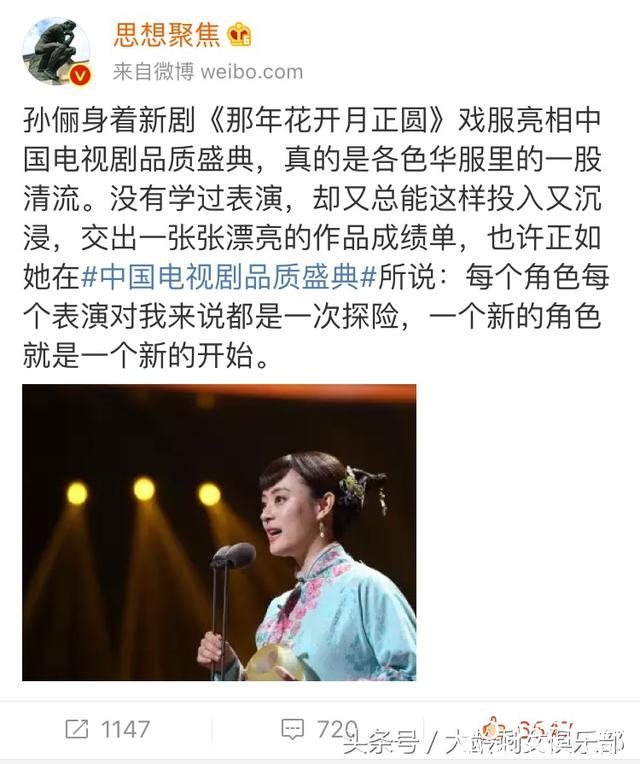 今天看到孙俪参加中国电视剧品质盛典的照片,孙俪当天身穿着新剧《那年花开月正圆》里的服装参加。