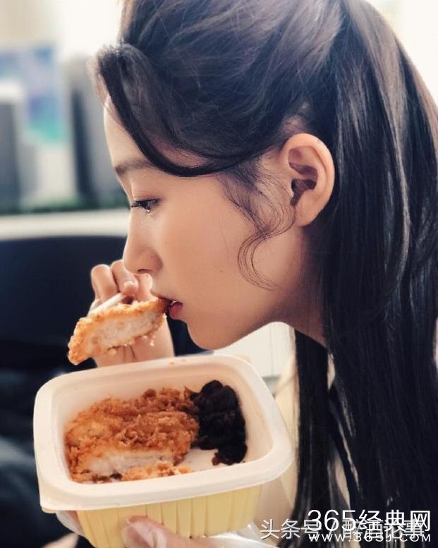 关晓彤吃的鸡排饭,看起来还不错,吃怎么能忘记自拍呢,这侧脸也是美如画了……