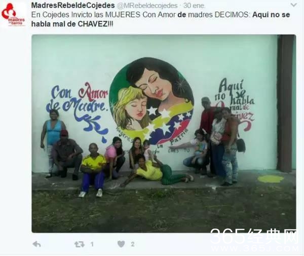 委内瑞拉妇女组织在街头合影,身后的涂鸦中包含“这里不说查韦斯的坏话”字样。