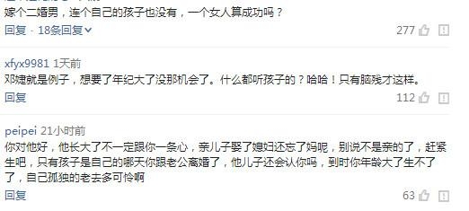 陈好曾言,今后是否生子会考虑继子的意见。然而,网友却说,千万不要步邓婕的前尘。毕竟邓婕也是做了张默多年的后妈,为了张默,没有生子。当初也曾怀孕,只是因为张默的离家出走、坚决反对,最终打掉。张国立甚至建议她“不如养条狗”。如今的邓婕万分后悔,曾多次在采访中为此落泪。