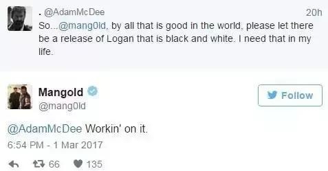 有位网友@了一下导演,表示希望看到黑白版的《金刚狼3》,而导演詹姆斯·曼高德则在推特上回复表示此版本“正在制作中”,证实了黑白纪念版将会推出。
