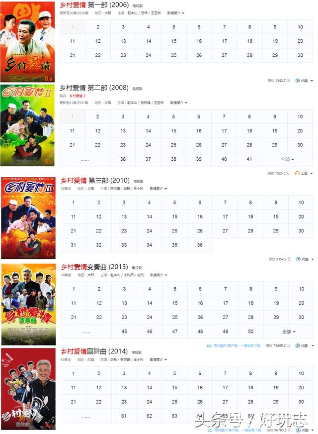 电视剧好不好看,数据会给我们一个参考,我们选取了目前国内三大网络视频播放平台优酷土豆、腾讯视频以及搜狐视频的数据进行了粗略的统计,发现《乡村爱情》系列电视剧的总播放量已经突破70亿次!