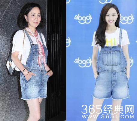 同款背带裙,唐嫣是甜美的校花,刘嘉玲是穿错女儿衣服的尴尬阿姨。