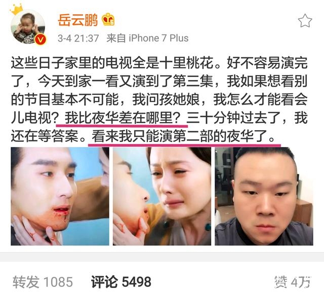 但是小岳岳似乎是吃了夜华的醋,因为老婆长期霸占电视感到愤愤不平:“我问孩她娘,我怎么才能看会儿电视?我比夜华差在哪里?三十分钟过去了,我还在等答案。看来我只能演第二部的夜华了。 ”