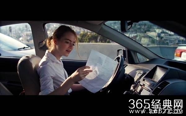 影片一开始,男女主角都塞车在高速路上。Mia开着省油的日本车,还在看剧本记台词▼