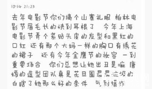 接着就是唐嫣粉丝因为不满唐嫣在金鹰节和各大电影节的山寨造型把经纪团队数落一遍....