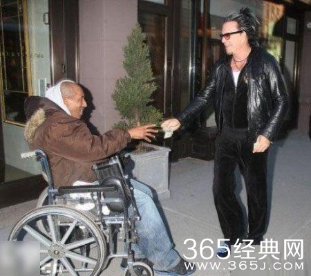 同是遇见坐着轮椅的乞丐,影帝米基-洛克看见就一面笑着一面递着钱走过去。乞丐满脸的笑容估计是实在太满足了。