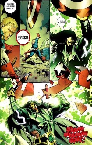 大家群殴格雷戈里,其中托尔一锤子甩过去,被格雷戈里接住,轻蔑一笑“托儿,你省省吧!”,然后一锤子下去美队的盾牌碎了。