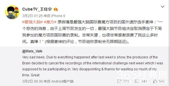 没有意外的发展,王鹰豪与贾立平即将联手参与国际挑战赛,事与愿违,王佳宇转发麦神的微博,取消了魔方项目国际赛的录制, 是怕再一次被秒杀吗?王鹰豪出色的实力稳坐名人堂席位,贾立平你做在名人堂席位上脸不红吗?王鹰豪的内心是崩溃的!