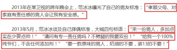 早年,范冰冰曾在接受采访时透露择偶标准:“有型,让人兴奋,但是又很安全,很稳定。”“孝顺父母、对家庭有责任感的男人会让我有安全感。”“100%纯爷们”等等。