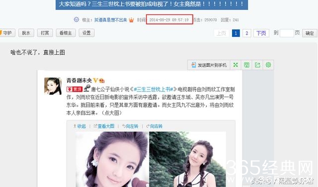 于是,娱乐君扒了一下关于《三生三世枕上书》的新闻,确实找到了讲刘雨欣工作室购买版权的帖子,并且男主希望找汪东城或吴亦凡来饰演,仔细一看,发帖的时间是在2014年8月,可见人家是真的老早就把版权买下来了。可能由于刘雨欣自身人气不足还有团队营销能力有限的原因,所以此事件未能大火。至于为什么一直没开拍,那就不得而知了。