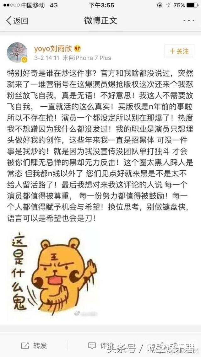 终于,刘雨欣受不了了,在微博上霸气的回应了谩骂,表示版权早在许多年就已经购买了,根本不存在抢版权炒作的事。啥都没说,就被骂,确实委屈。