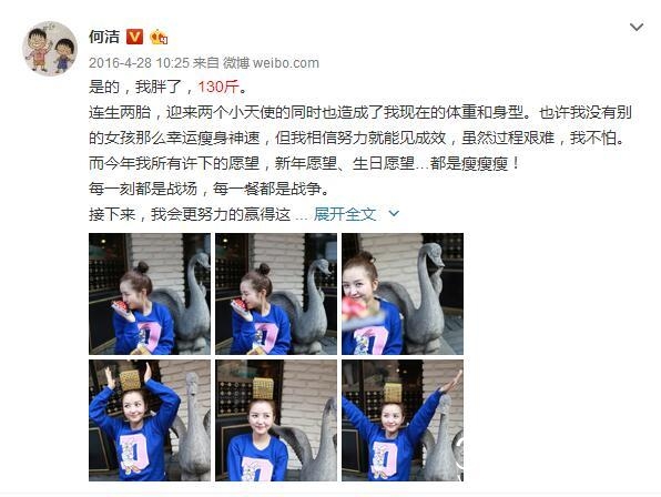 2014年7月,何洁生了第一个儿子“七宝”,2015年11月又马上生了一个女儿“宝妹”,到了2016年,何洁体重一直没有下来过,维持着130斤的体重。